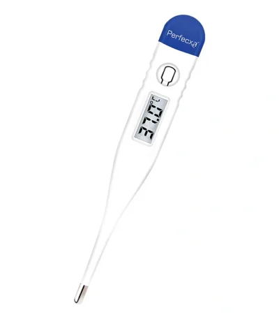 Perfecxa Digital Thermometer with quick and accurate readings within 10 seconds. Features a flexible tip for comfort and safety, suitable for oral, rectal, and underarm use. Waterproof for easy cleaning, digital display, and beeps when measurement is complete. Ideal for all age groups.
