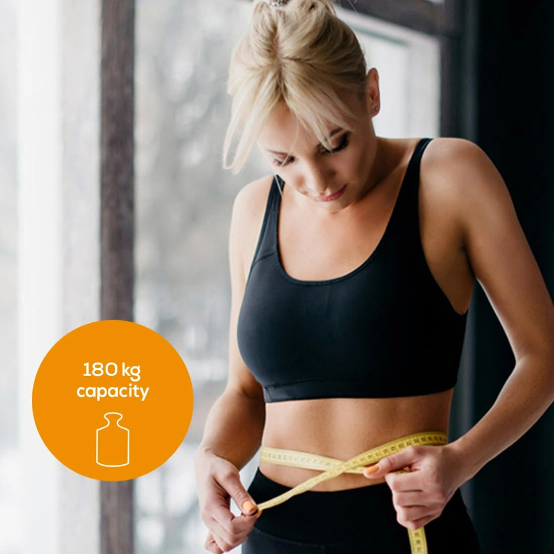 Sleek digital glass scale with LCD display, 180 kg capacity, automatic switch-off, and safety glass.