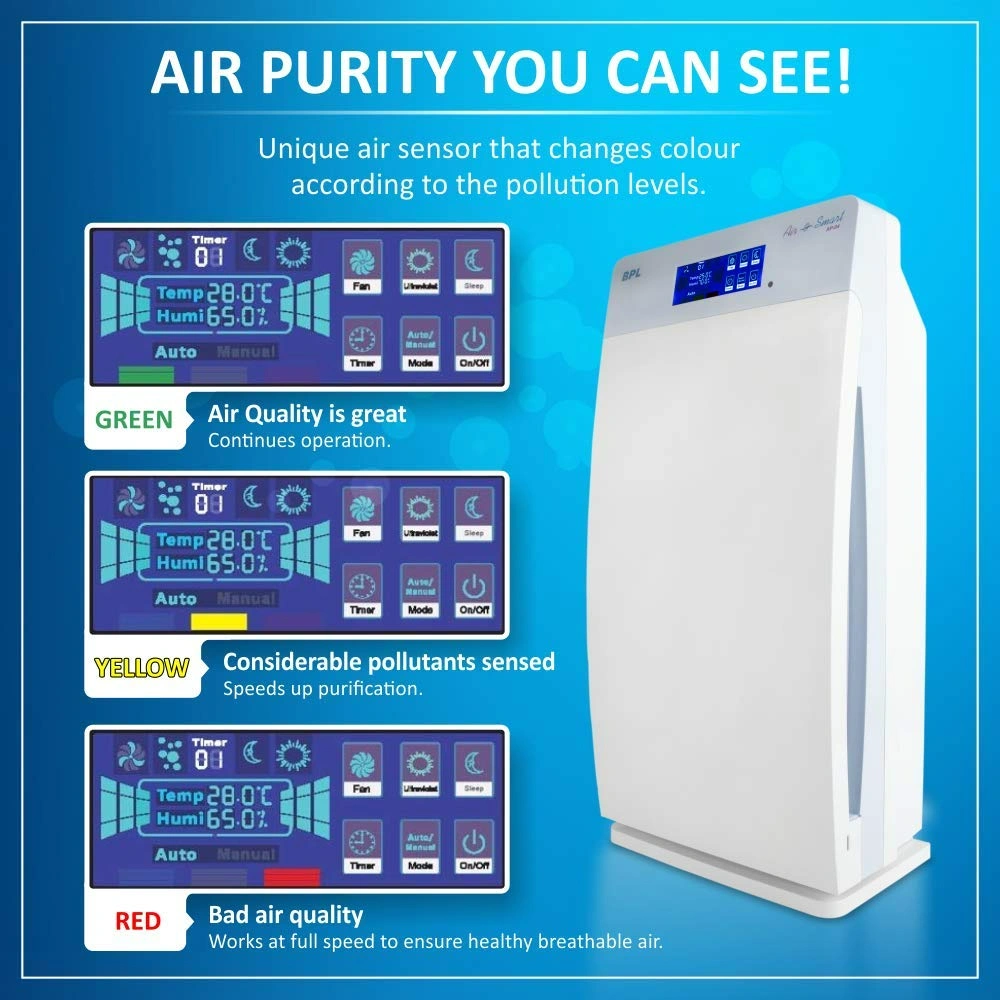 The BPL AP-04 Air Purifier features a 6-layer filtration system, including HEPA, activated carbon, and UV filters, which effectively remove 99.97% of impurities in the air. It has a high Clean Air Delivery Rate (CADR) of 190 m³/hr and covers an area of up to 500 sq. ft. The purifier includes a high-resolution touch screen for easy operation, with three modes: Auto, Manual, and Sleep. It also has an air quality sensor with color indications (blue, yellow, red) and a timer function. Its sleek design and quiet operation make it ideal for home and office use.