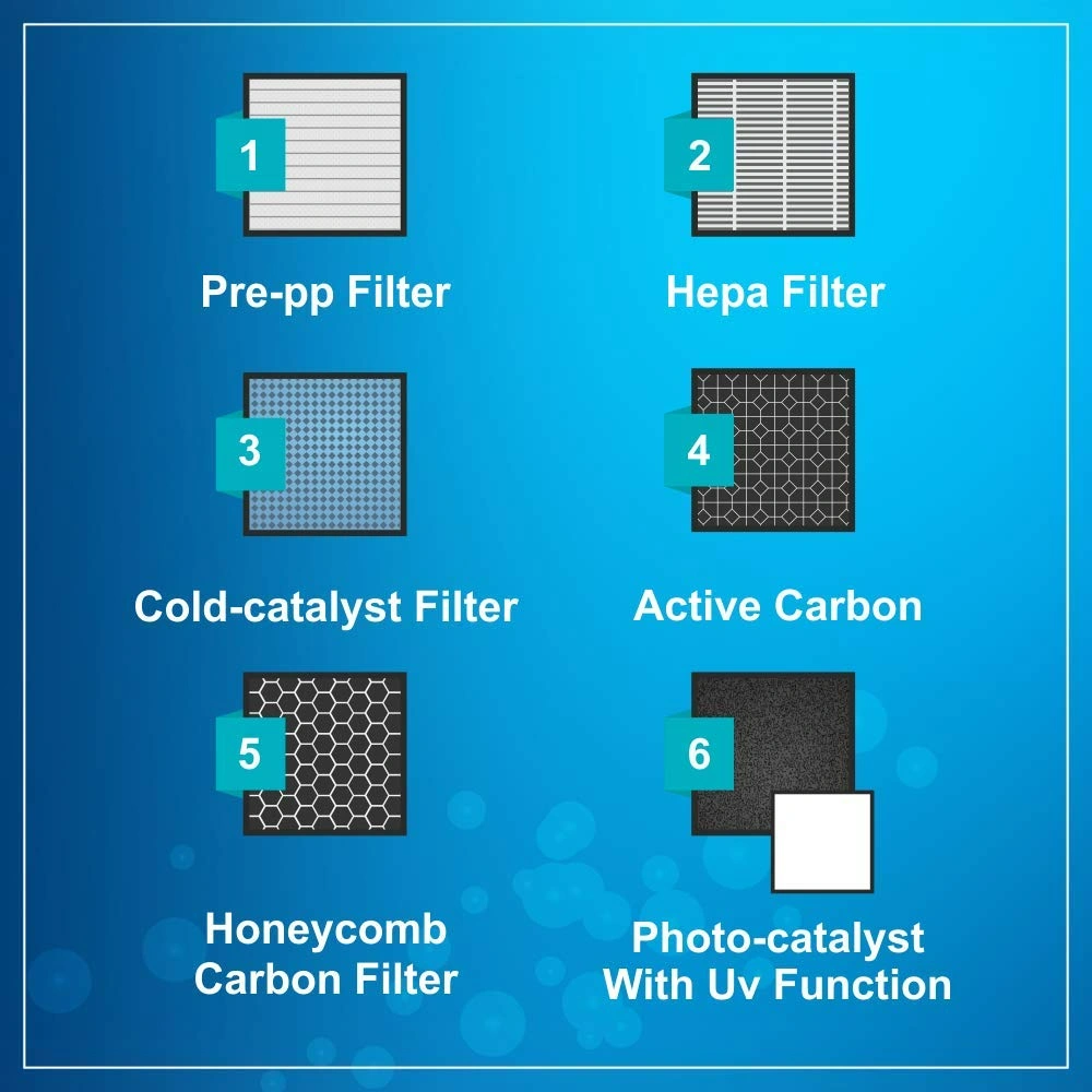 It uses a 6-layer filtration system including HEPA, activated carbon, and UV filters.