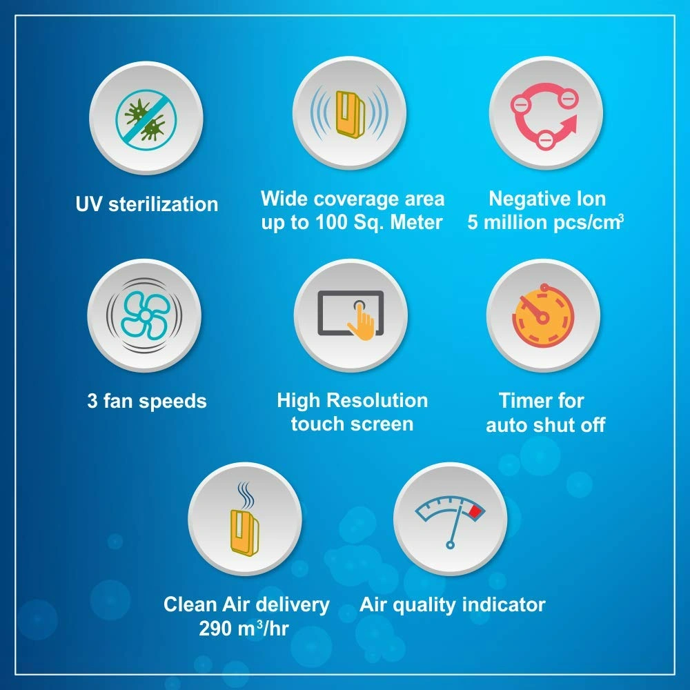 Air purifier with 6-layer filtration system, including HEPA, activated carbon, and UV filters. High CADR of 190 m³/hr, covers up to 500 sq. ft. Features touch screen, three modes, air quality sensor, and timer function. Sleek design and quiet operation.