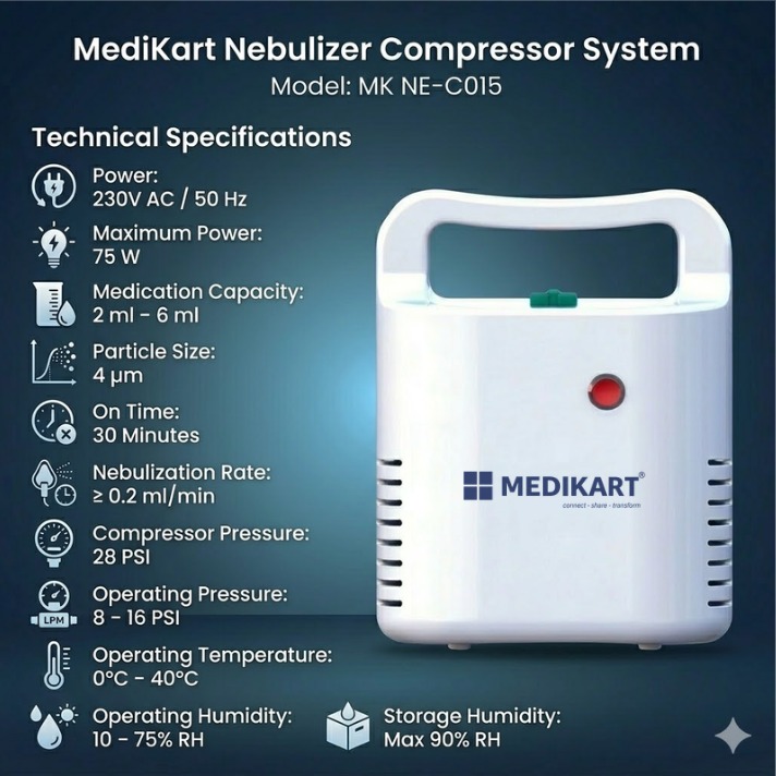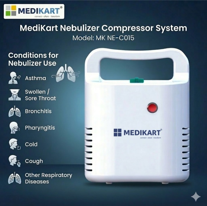 Medikart Compressor Nebulizer System MK NE-C015 is a powerful and reliable respiratory therapy device designed to provide effective medication delivery directly to the lungs. This high-efficiency compressor nebulizer converts liquid medication into a fine aerosol mist, allowing patients to inhale the medicine easily and comfortably. It is an ideal solution for individuals suffering from respiratory conditions such as asthma, bronchitis, cough, cold, sore throat, and other breathing-related disorders. The Medikart Nebulizer Machine is suitable for both adults and children, making it a practical and convenient device for family healthcare needs. With its advanced compressor technology, the MK NE-C015 ensures consistent airflow and efficient nebulization performance during each therapy session. The fine particle mist generated by the nebulizer helps medication reach deep into the respiratory tract, providing faster relief and improving breathing comfort. This compressor nebulizer is especially useful for people who require regular respiratory therapy at home. Its simple operation makes it easy to use for elderly users, children, and patients who require daily treatment. The device is engineered to deliver stable performance and effective medication delivery, helping users manage respiratory symptoms more comfortably. Whether used for managing asthma attacks, relieving congestion caused by colds, or supporting treatment for bronchitis and other respiratory conditions, the Medikart Compressor Nebulizer System MK NE-C015 provides dependable therapy support. Designed with durability and efficiency in mind, this nebulizer machine offers a practical and effective solution for respiratory care. With its powerful compressor system and high-quality construction, it ensures long-term reliability for daily use. The inclusion of essential accessories such as masks, mouthpiece, and air filters makes the device ready for immediate use, offering a complete respiratory therapy solution for patients at home.