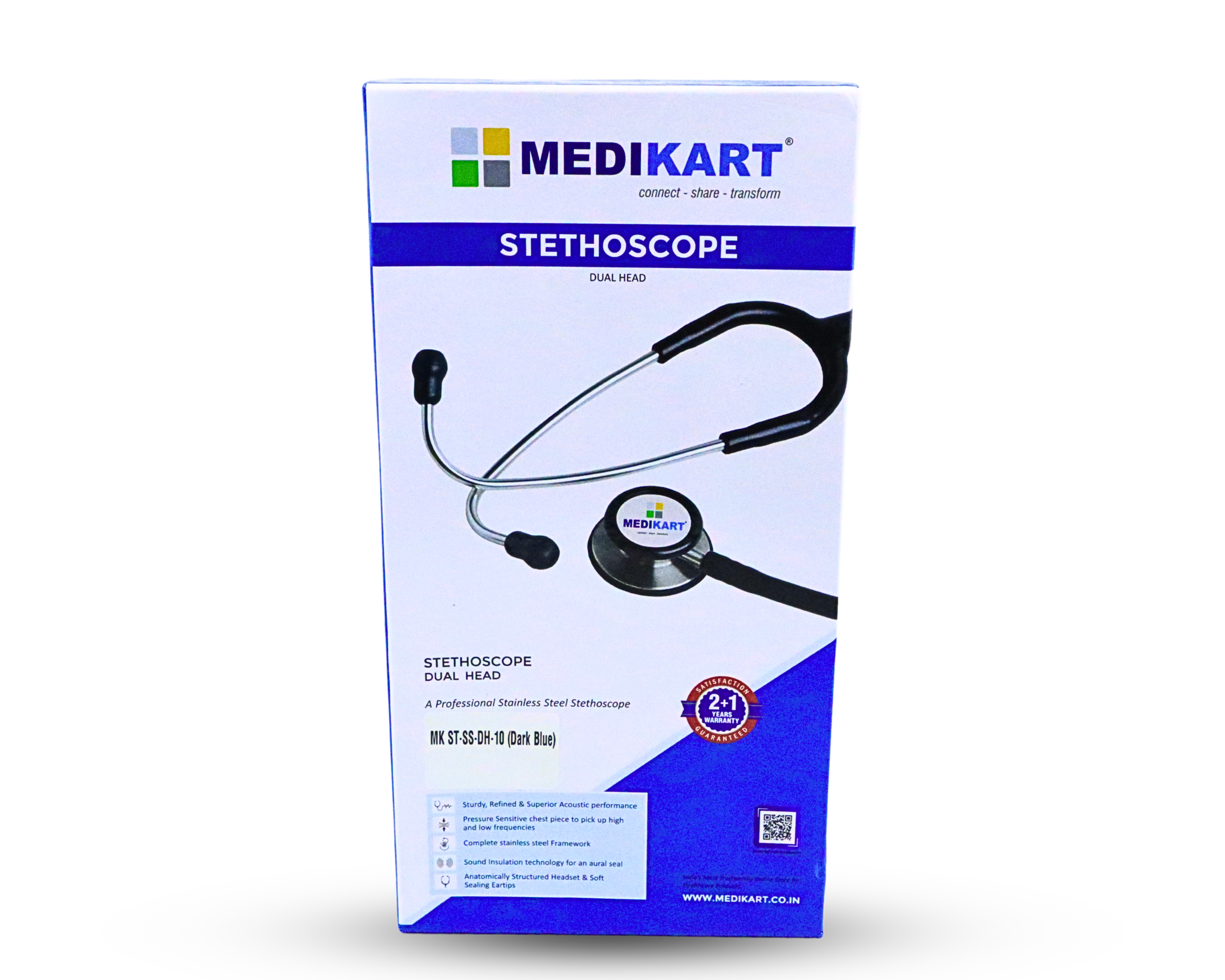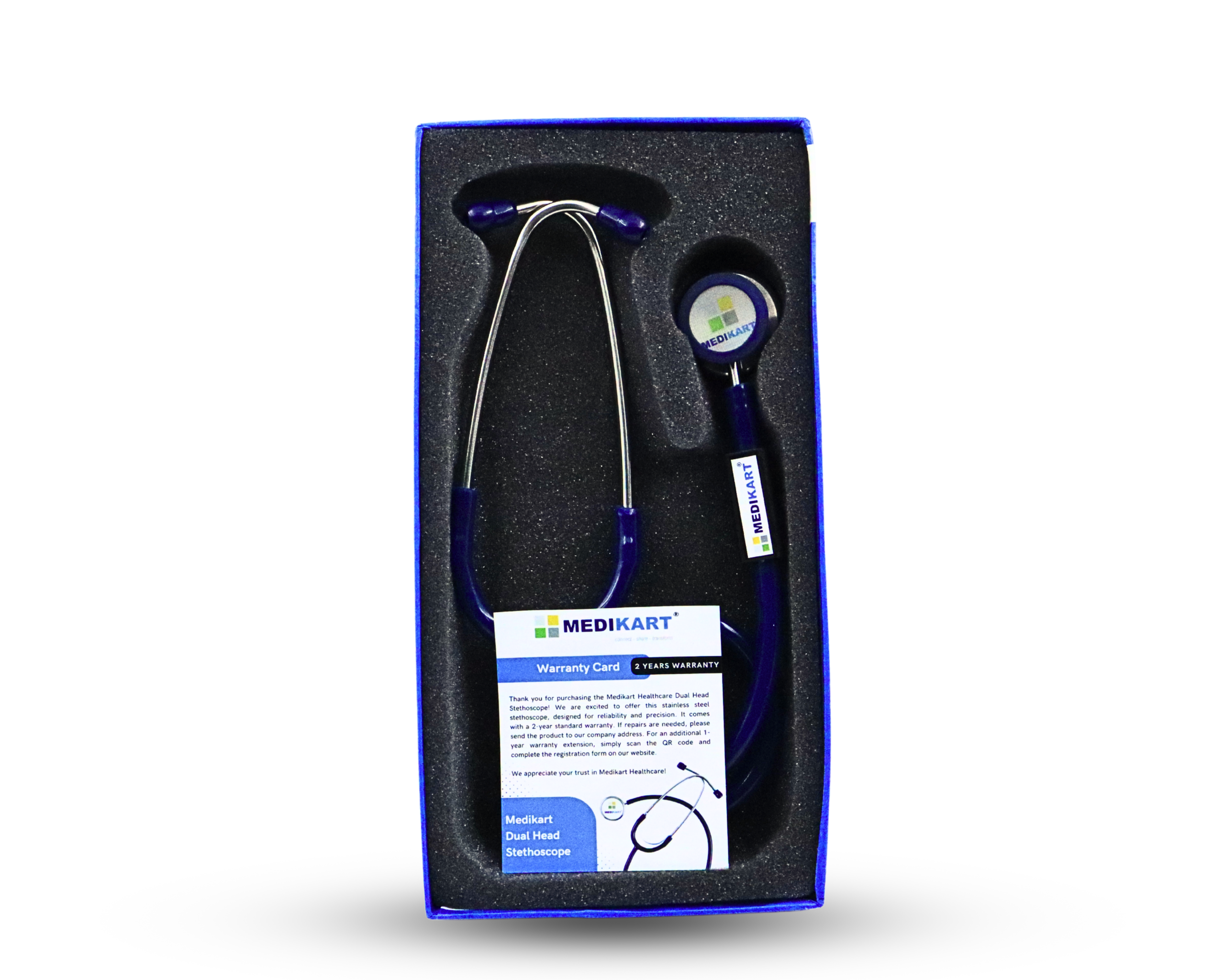This premium stethoscope comes with a 2+1 year warranty. Customers receive a standard 2-year warranty, with the option to extend it by an additional year by simply registering the product on the Medikart website. This ensures long-term reliability and peace of mind.
