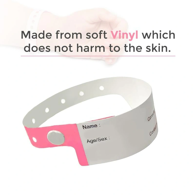 Durable and hypoallergenic patient identification bands for hospitals. Waterproof, tear-resistant, and easy to write on. Pack of 100 bands with snap closure for secure fit.