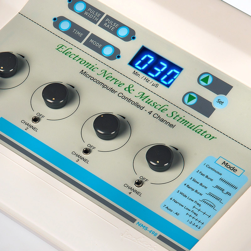 The NMS-498 is an advanced nerve and muscle stimulator designed for effective pain management and muscle rehabilitation. It offers seven different modes of NMES stimulation tailored to specific muscle groups. This microcomputer-controlled unit combines proven therapies to meet rehabilitation needs, including EMS and TENS applications. It is ideal for wrist strengthening, grip strengthening, fibromyalgia, tibialis strengthening, ACL reconstruction, intrinsic strengthening, quadriceps strengthening, anterior shoulder subluxation, upper trap spasm, shoulder weakness, and more.