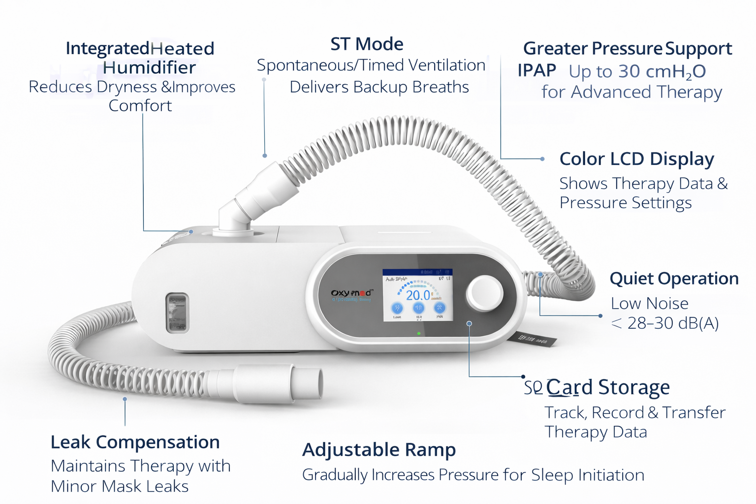 Oxy-med AirSmart ST 30 BiPAP machine provides advanced Spontaneous/Timed ventilation with heated humidifier and full-face mask. Designed for sleep apnea, COPD, and respiratory insufficiency therapy with precise pressure control up to 30 cmH₂O.