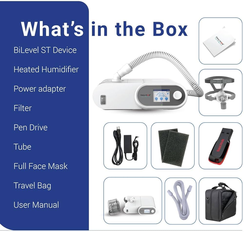 Oxymed AirSmart BPAP ST with Humidifier comes with a pressure range of 4–30 cm H2O & supports S/T, CPAP PC, T, VAT, and S modes. The turbine of the Oxymed AirSmart BPAP ST is made in Germany.