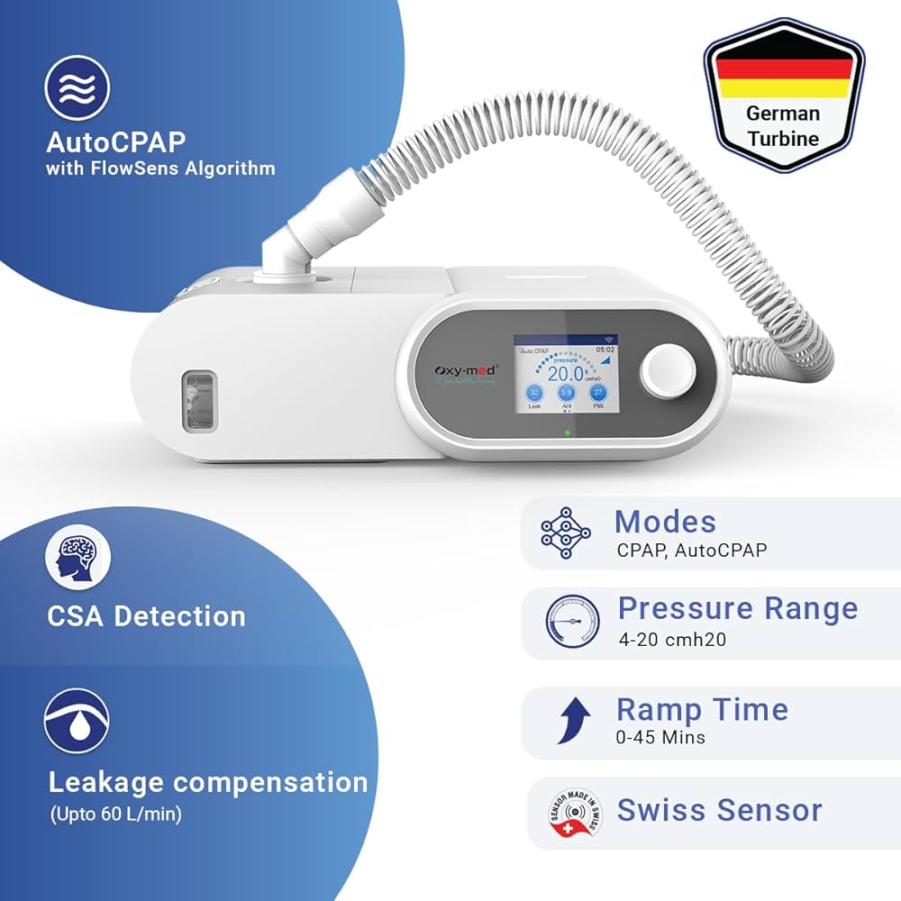 The Oxymed SleepEasy (German Turbine) AutoCPAP is an FDA-approved, automatic positive airway pressure (Auto CPAP) therapy device designed to deliver comfortable, intelligent sleep apnea treatment at home. Complete with a high-efficiency filter, it ensures clean airflow and reliable therapy throughout the night.