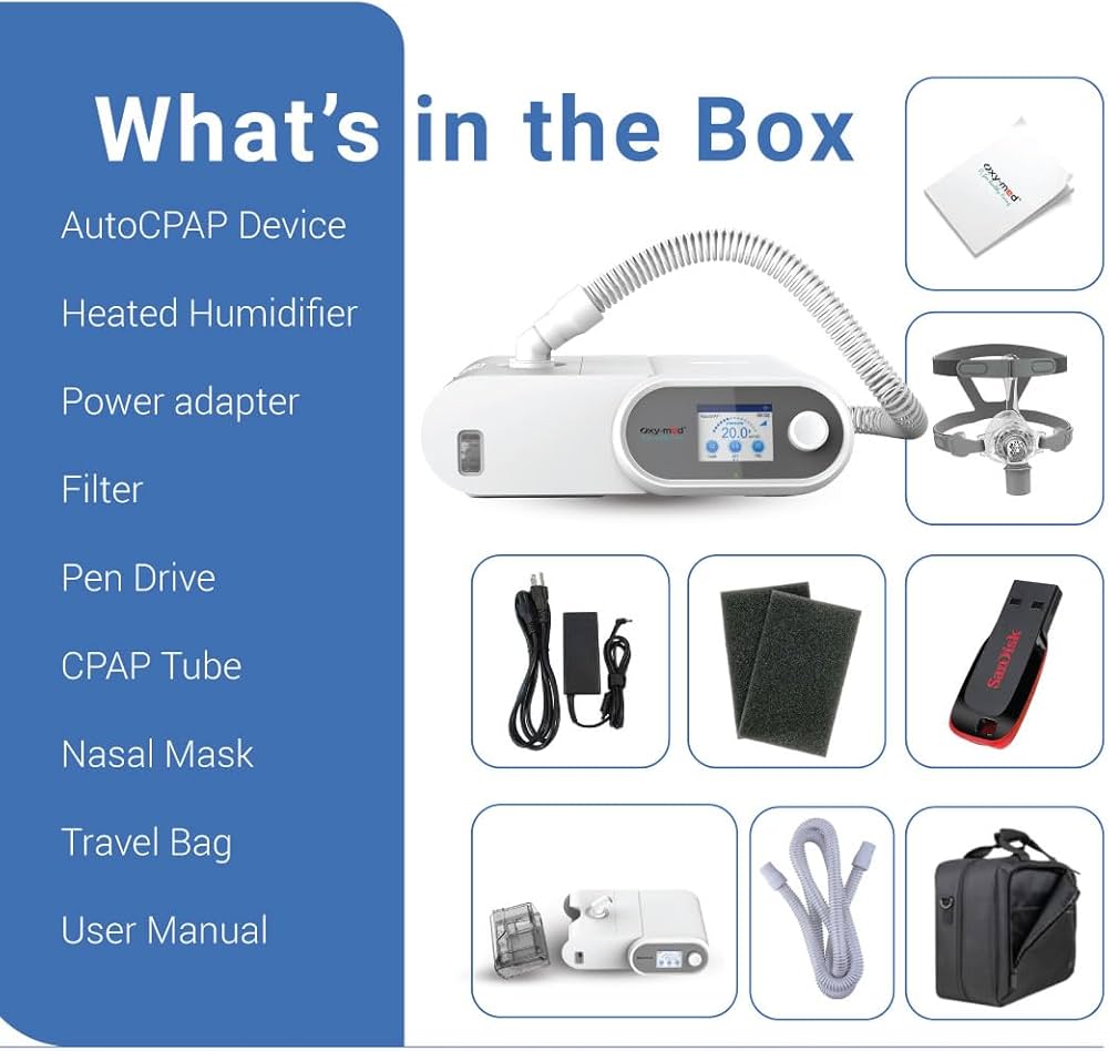 | • 1 × Oxymed SleepEasy Auto CPAP Machine • 1 × High Efficiency Air Filter (Pre-installed) • 1 × CPAP Power Cable & AC Adapter • 1 × CPAP Tubing (Standard) • 1 × User Manual & Quick Start Guide • 1 × Warranty Card / Service Booklet |