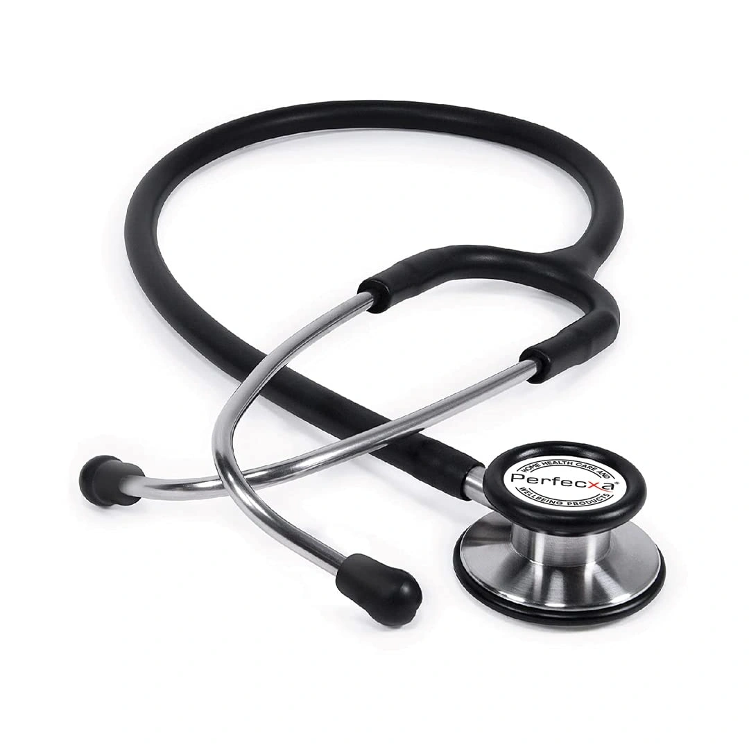 Perfecxa Aluminium Dual Head Stethoscope with lightweight chest piece, flexible latex-free tube, excellent acoustic performance, soft-sealing ear knobs, two-year warranty, ideal for doctors and medical students.