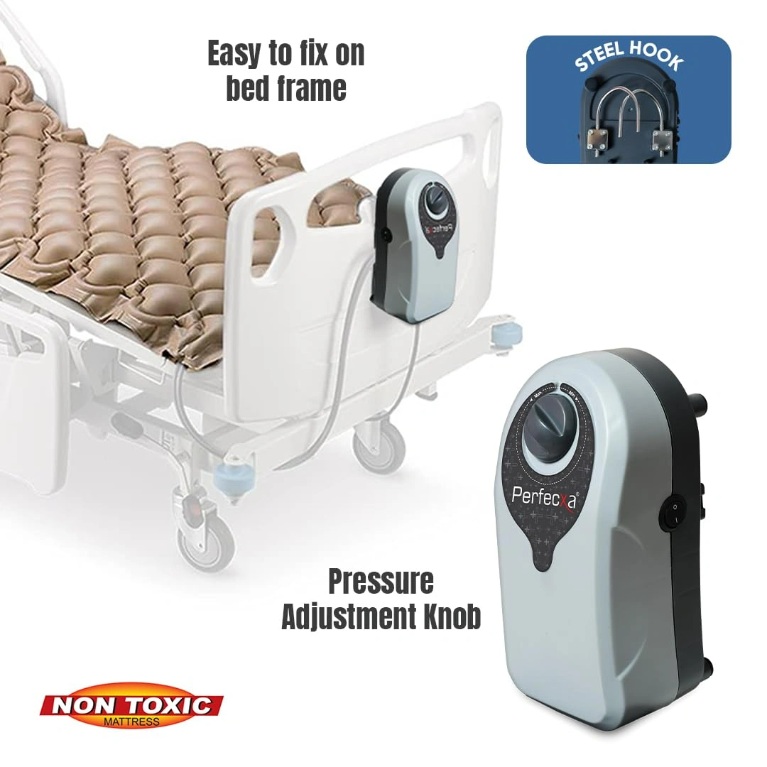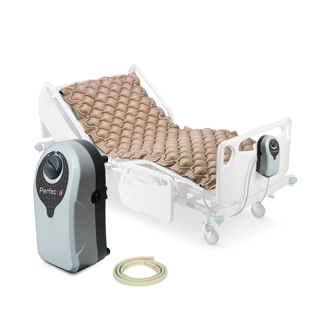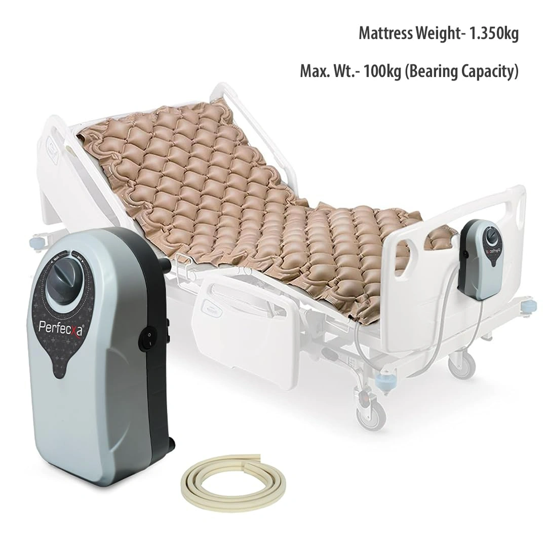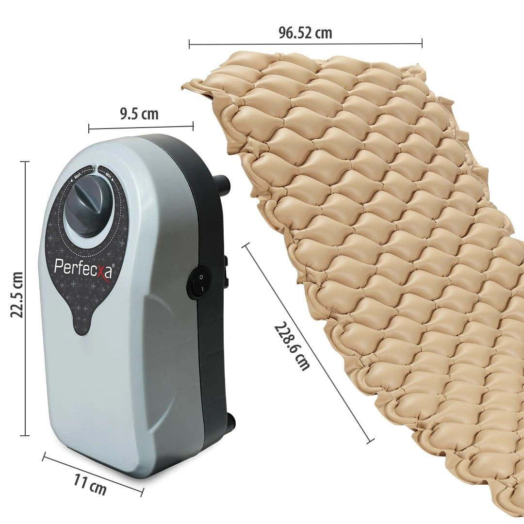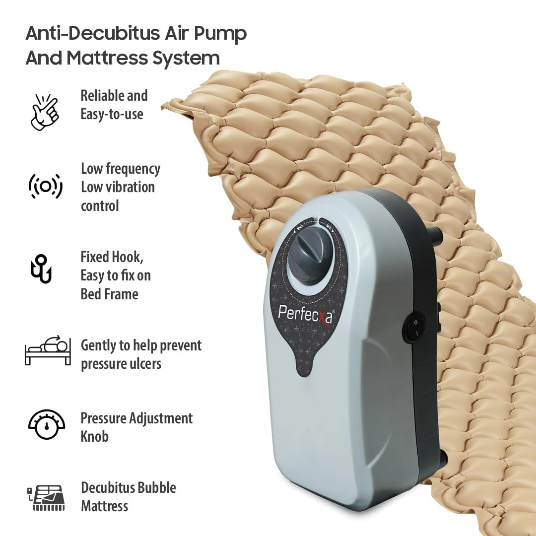 Perfecxa Anti-Decubitus Anti-Bedsore Bubble Air Mattress with alternating pressure pump, 7-minute cycle, durable non-toxic PVC material, 160 bubble cells, supports up to 120 kg. Ideal for preventing and managing bedsores and pressure ulcers.