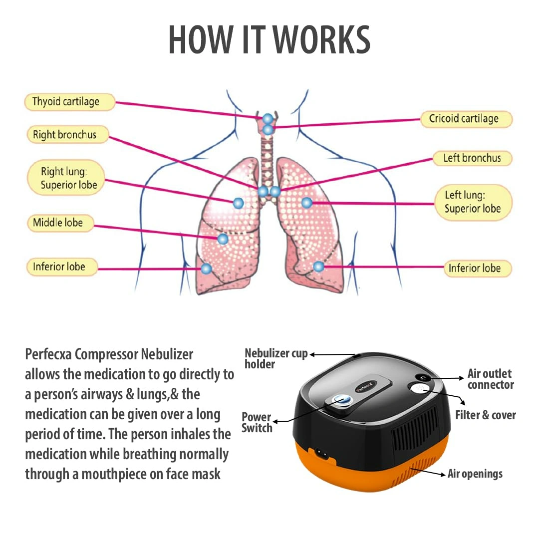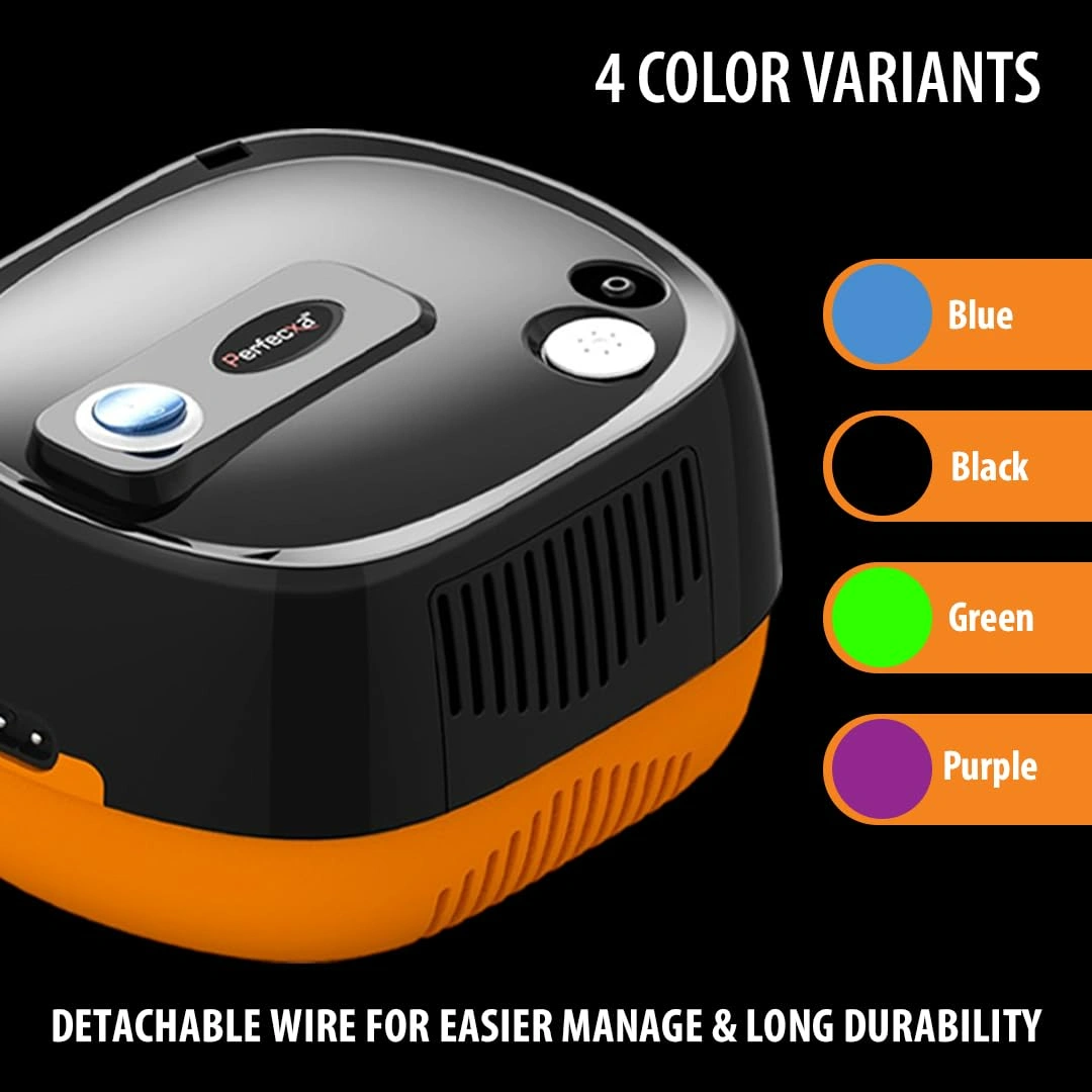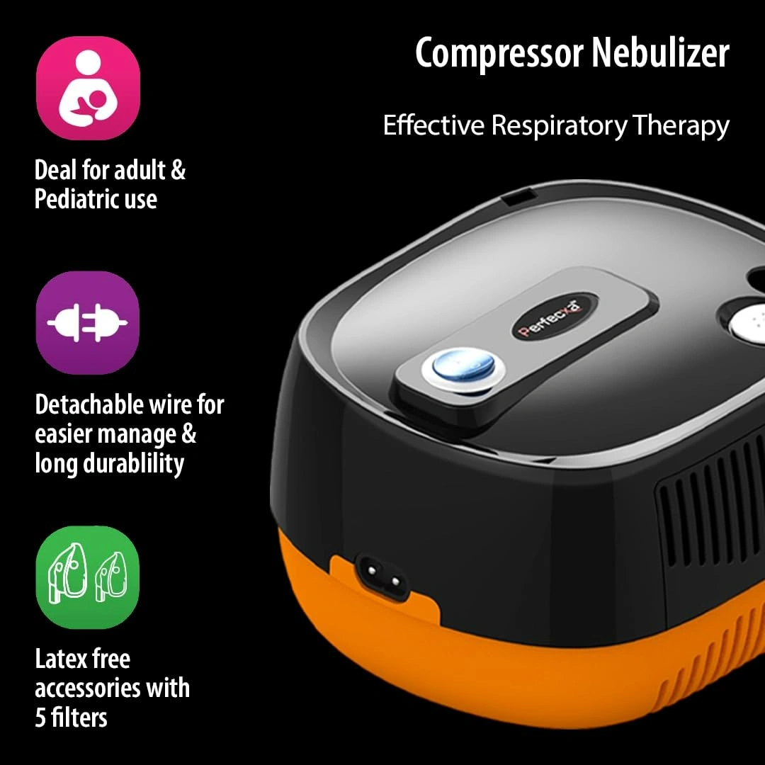 Perfecxa Compressor Nebulizer with a powerful compressor, adult and child masks, mouthpiece, and medication cup. Detachable wire for easy management and long durability. Lightweight, portable, and ensures effective medication delivery with minimal noise. Ideal for home use with a 3-year warranty.