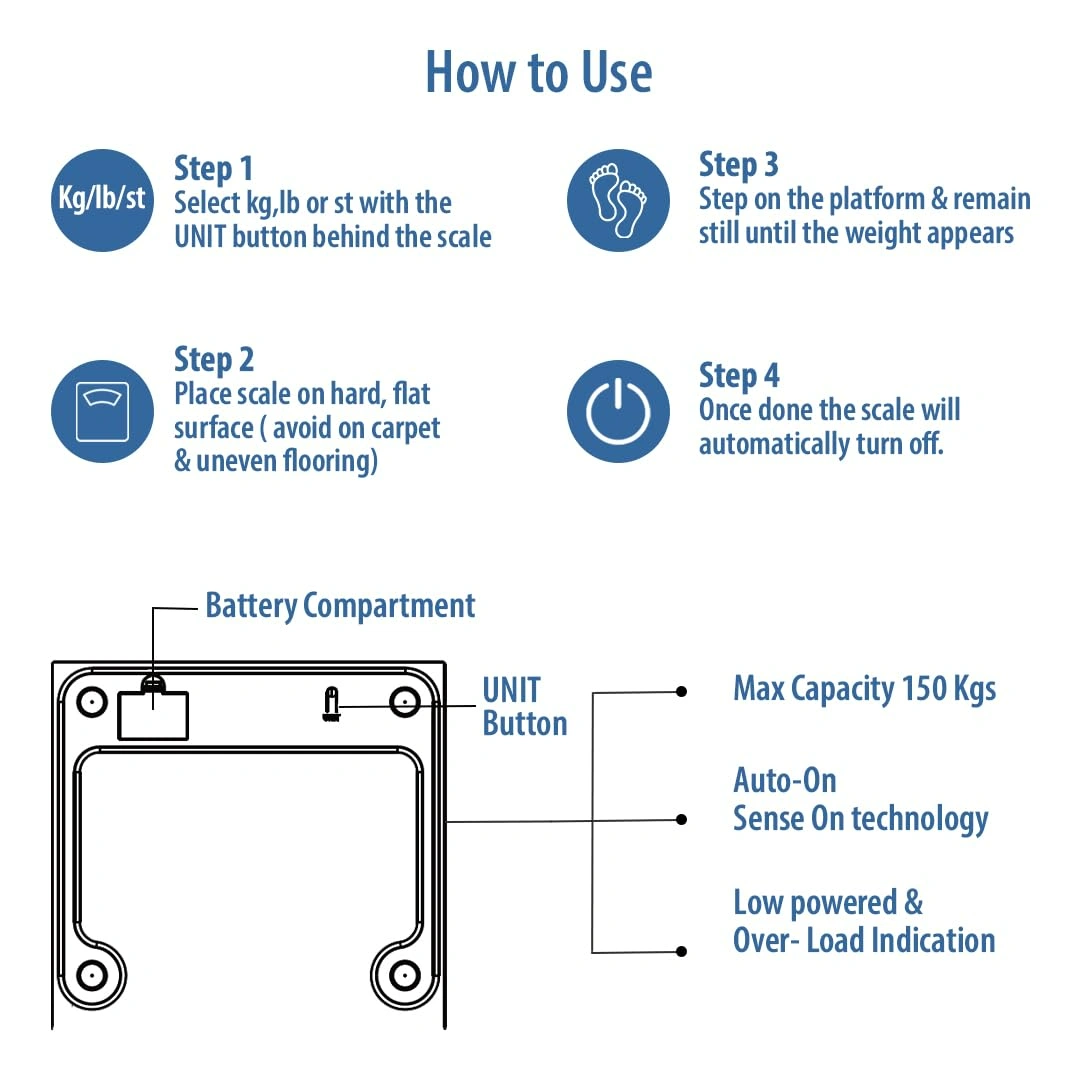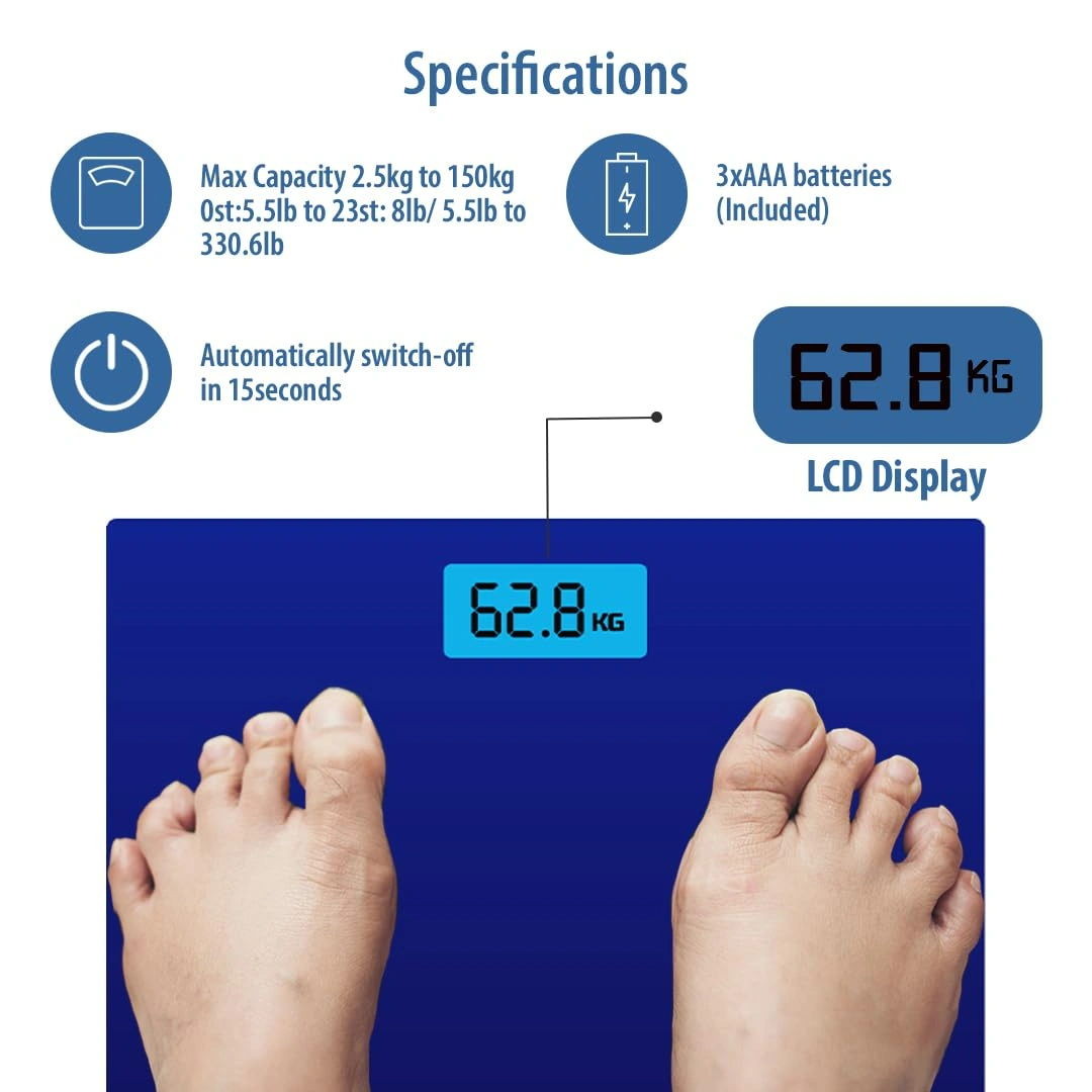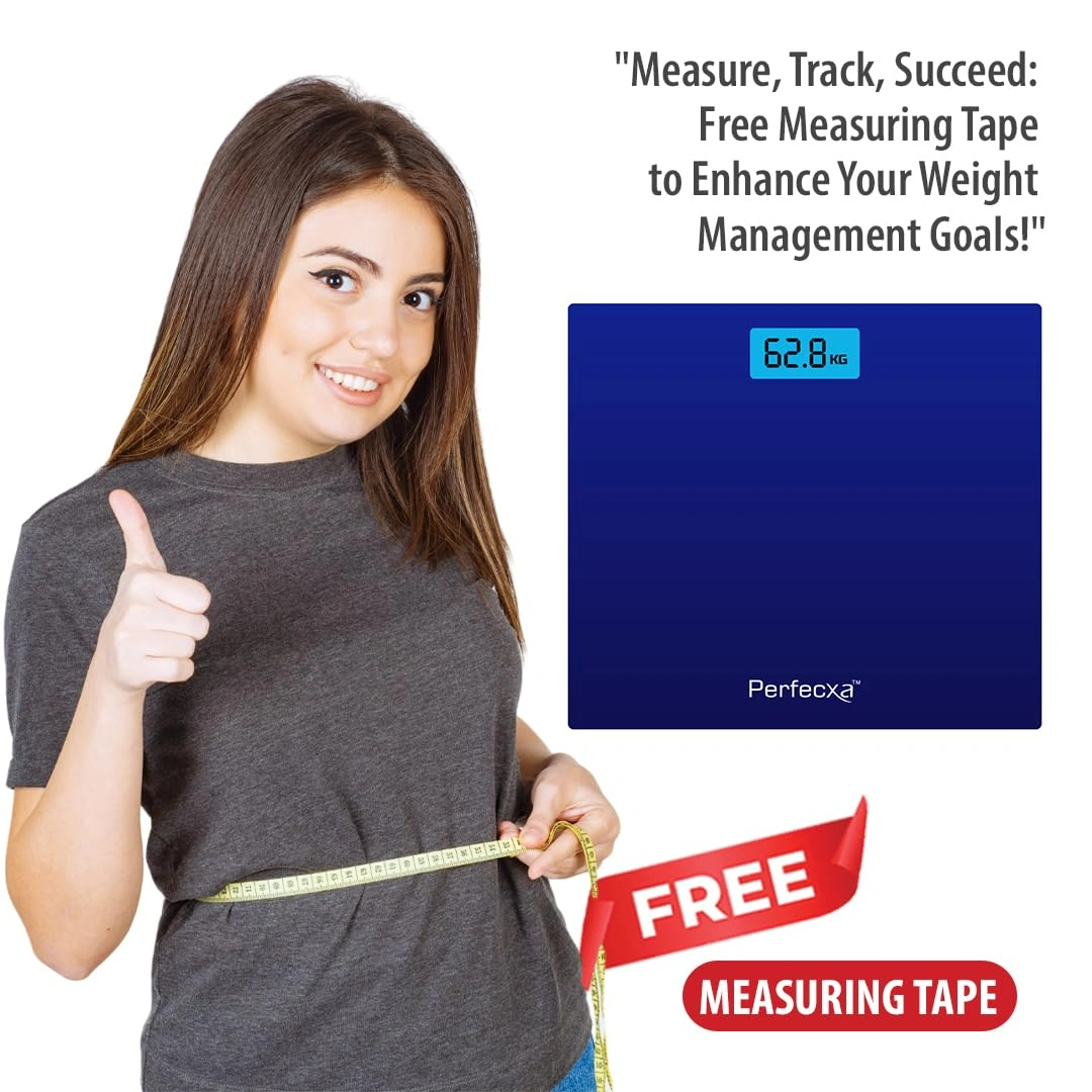 Perfecxa Digital Weight Machine with LCD Display, thick tempered glass, 150 kg capacity, auto on/off, powered by 3 AAA batteries, certified by Legal Metrology Department, accurate and reliable.