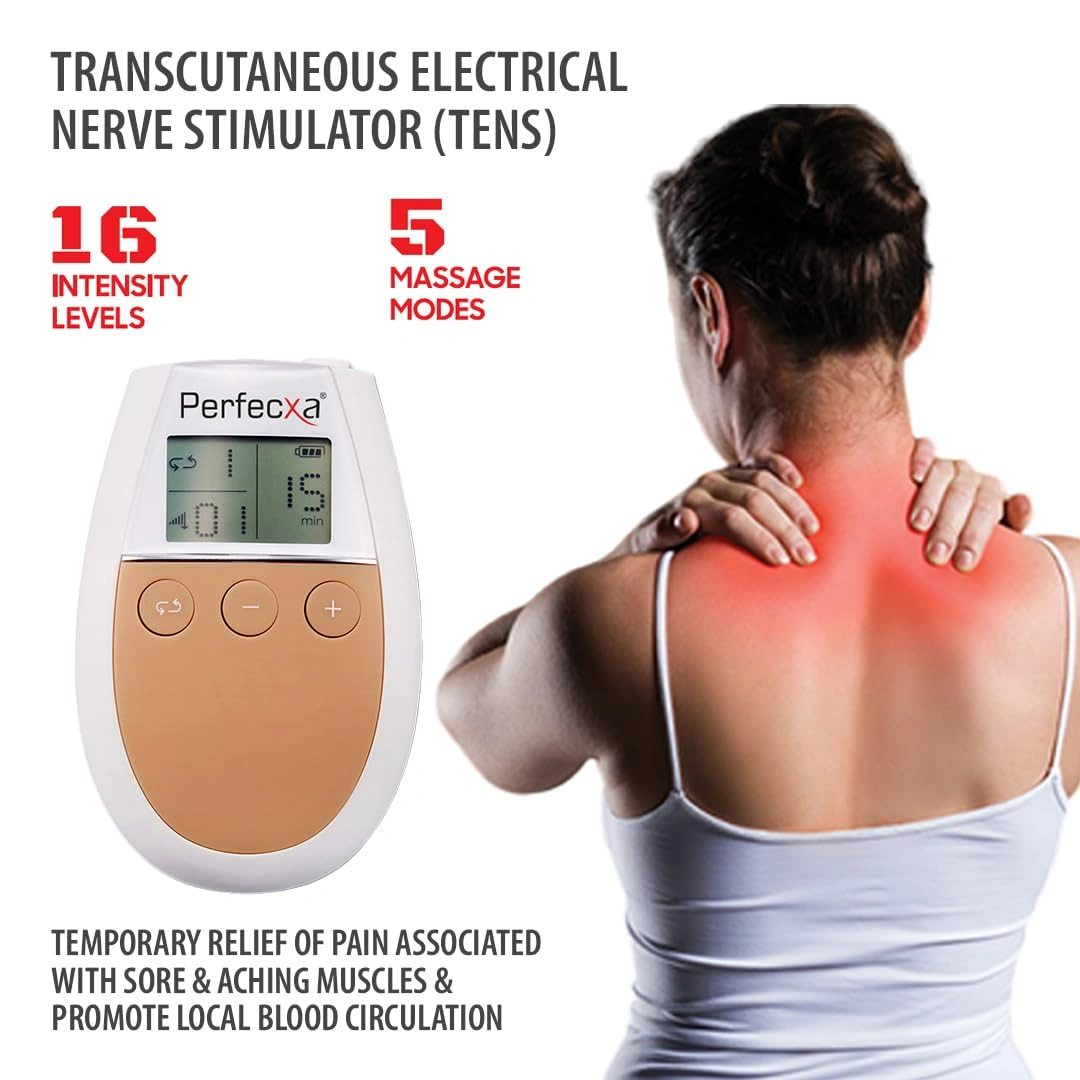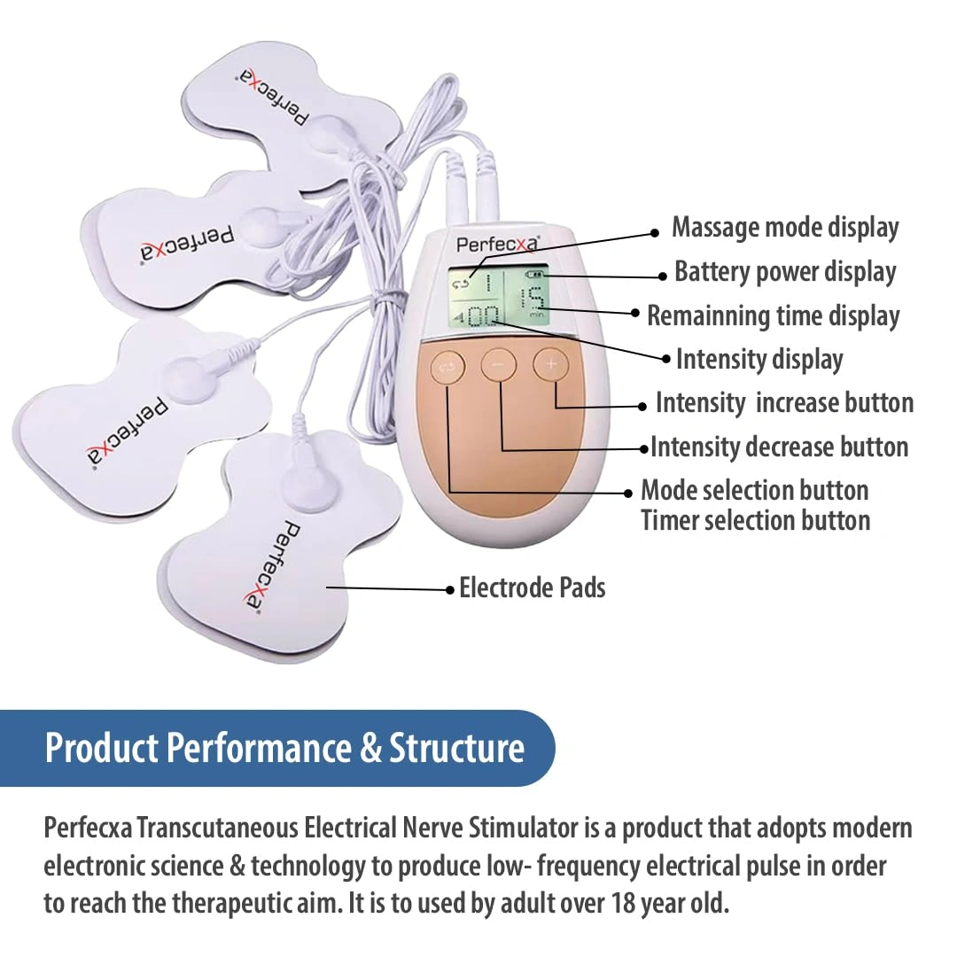 Perfecxa Electrical Stimulation Management Physiotherapy Device with multiple modes and intensity levels for pain relief and muscle stimulation. Portable, easy to use, and includes electrode pads, USB charging cable, and user manual. Ideal for chronic pain and muscle stiffness.