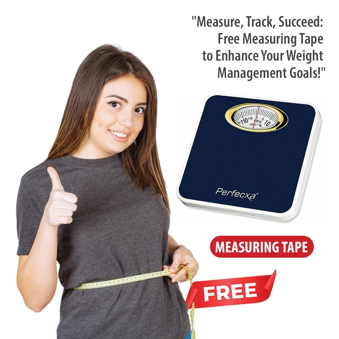 Perfecxa Mechanical Personal Weighing Scale with mechanical analog scale, weight capacity up to 120 kg, non-slip platform, durable construction, compact design, and 1 kg graduation for precise readings. Ideal for home use.