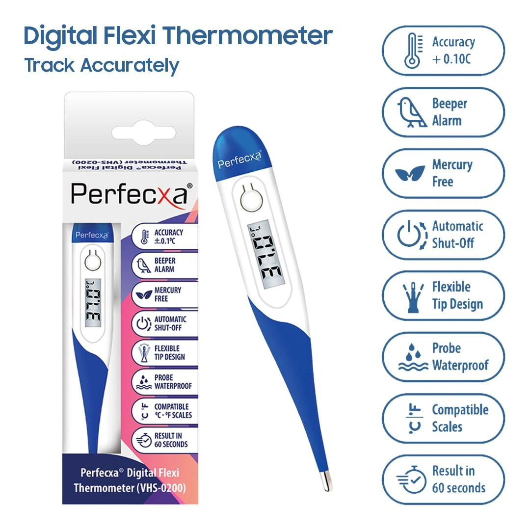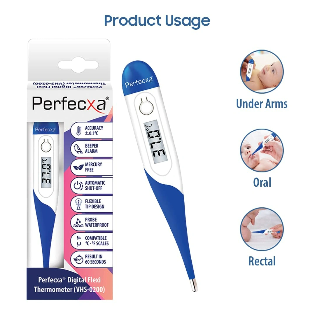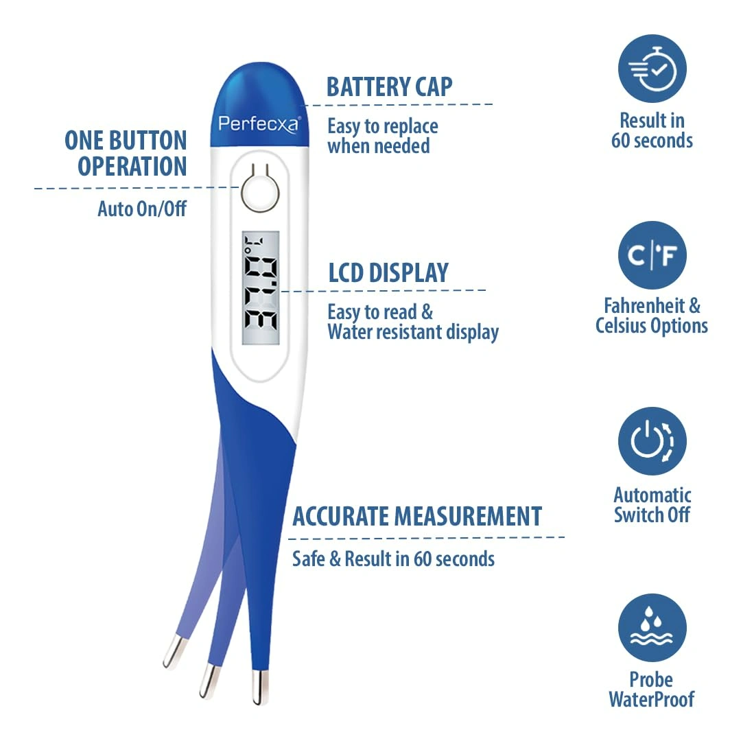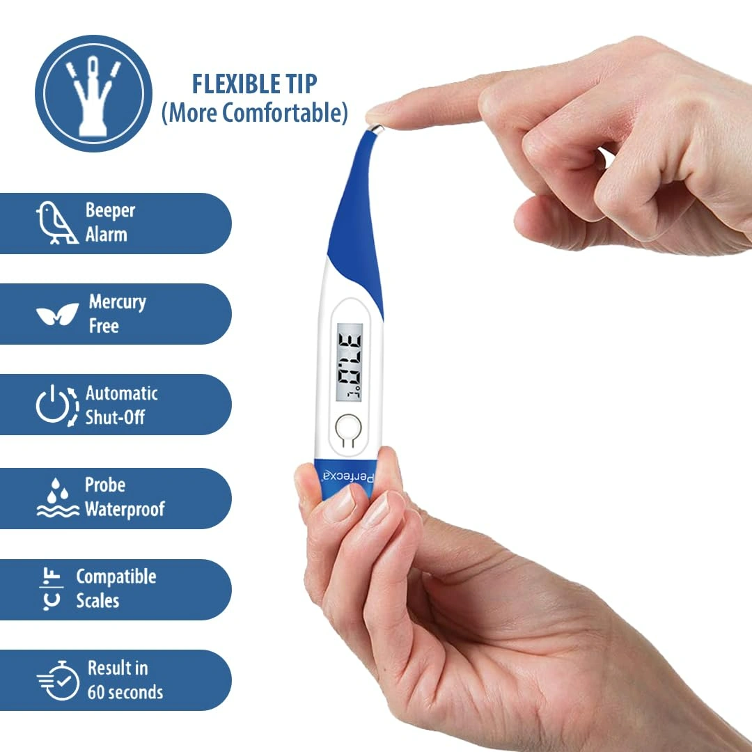 Perfecxa Waterproof Flexible Tip Digital Thermometer with quick and accurate readings. Features a flexible tip for comfort and safety, suitable for oral, rectal, and underarm use. Waterproof for easy cleaning, digital display, and beeps when measurement is complete. Ideal for all age groups.