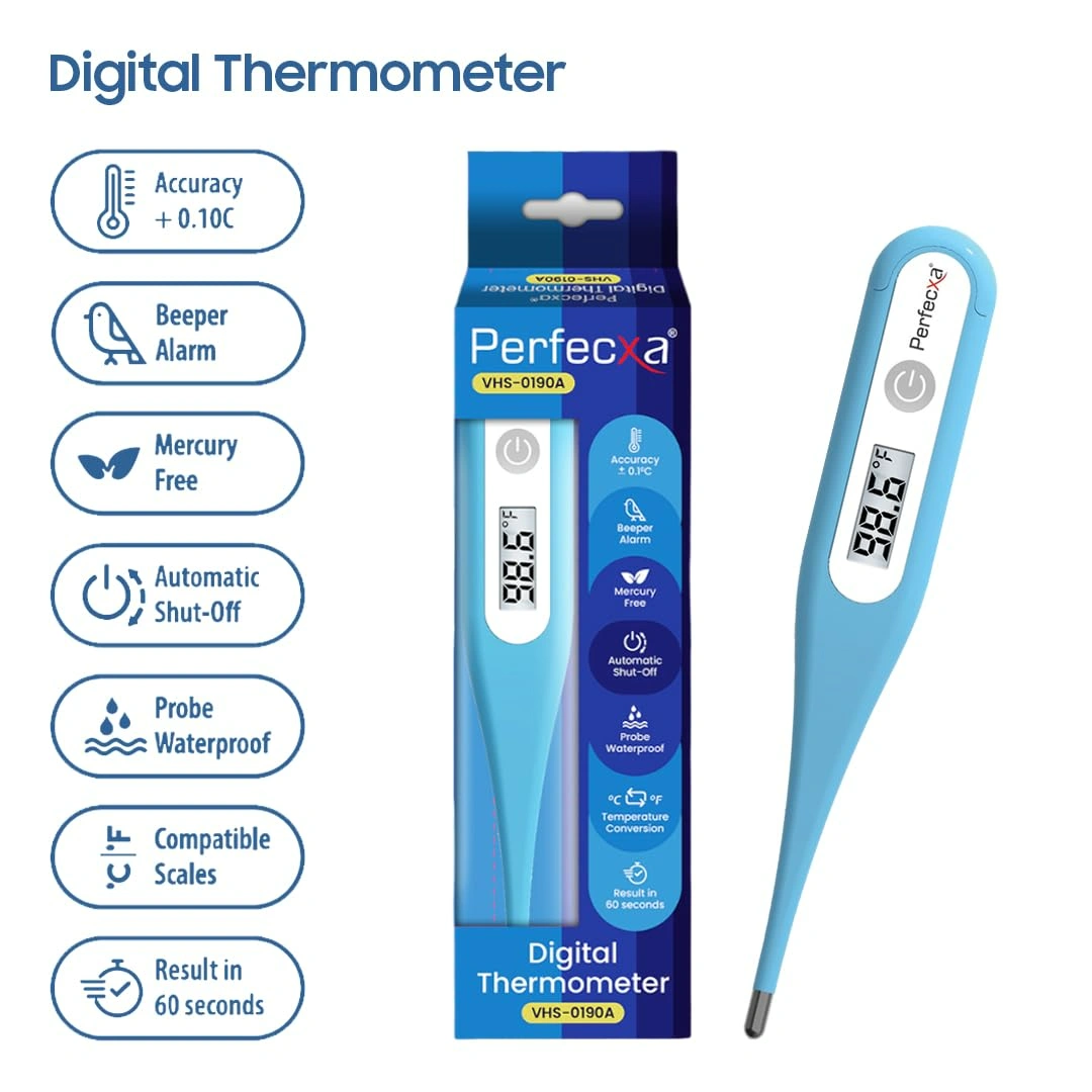 Perfecxa Waterproof Flexible Tip Digital Thermometer offers quick, accurate readings. Features a flexible tip for comfort and safety, suitable for oral, rectal, and underarm use. Waterproof for easy cleaning, digital display, and beeps when measurement is complete. Ideal for all age groups.