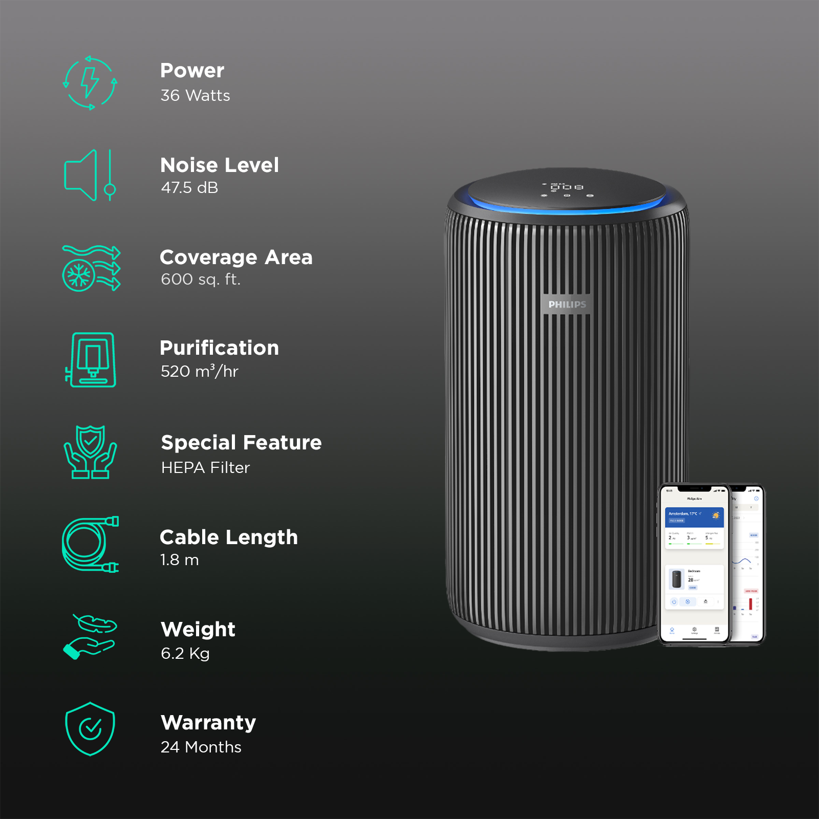 | Connectivity | Philips Clean Home+ App compatible (for remote control via smartphone) |