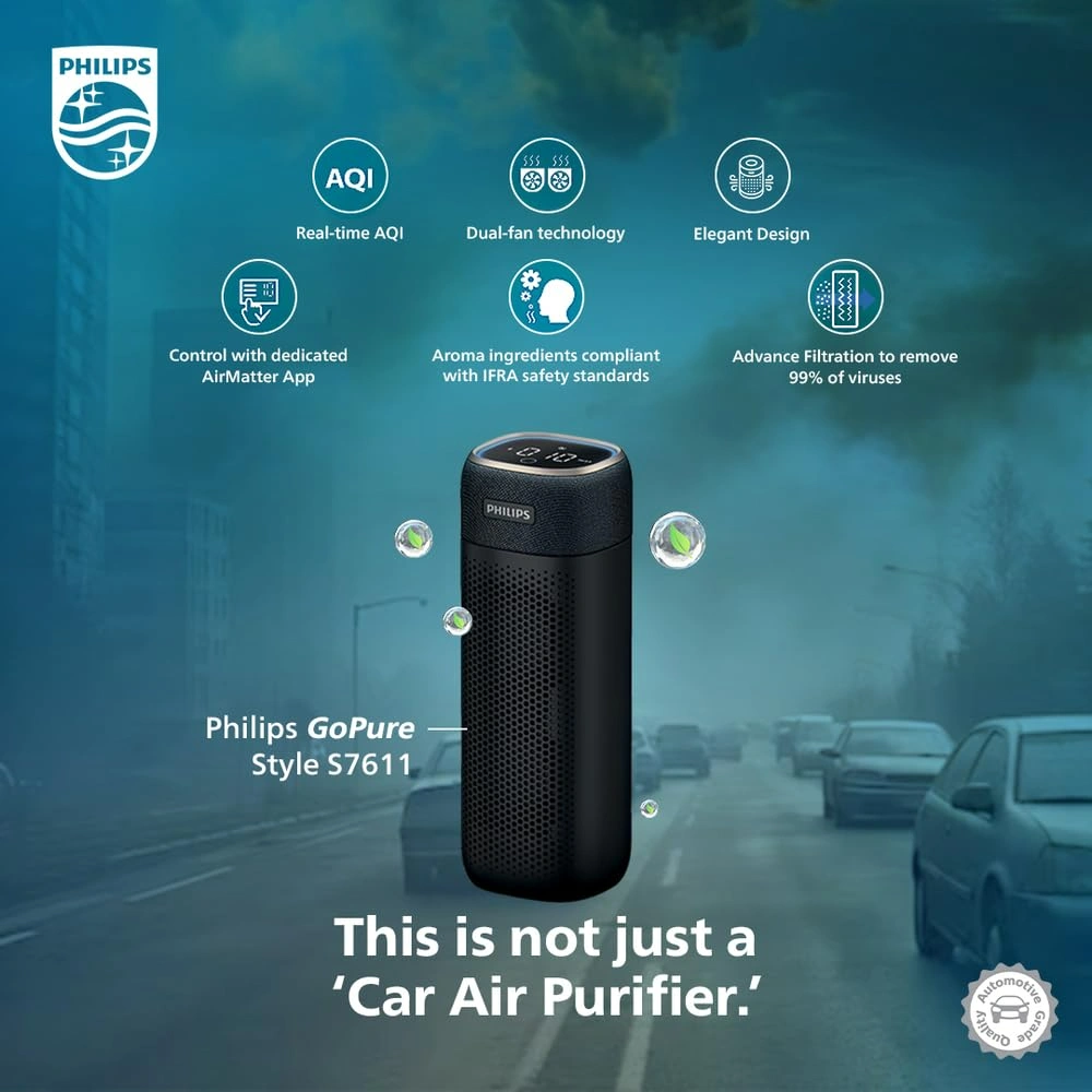 The Philips GoPure GPS 7611 is a powerful car air purifier featuring HEPA and HESA filters, dual fan technology, and a smart app for real-time monitoring. It captures 99.9% of ultra-fine particles as small as 0.004 µm and uses antiviral aroma to keep the air fresh and clean. The device includes a digital display to show air quality and other information, ensuring a healthy environment inside your car.