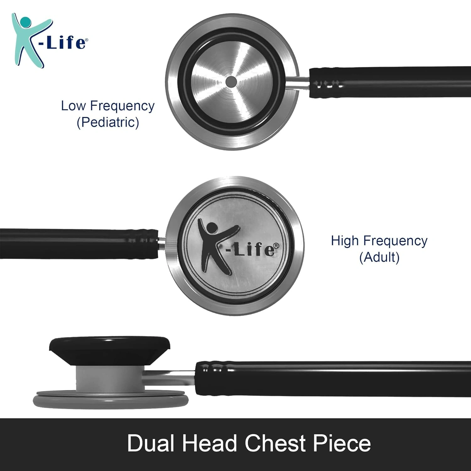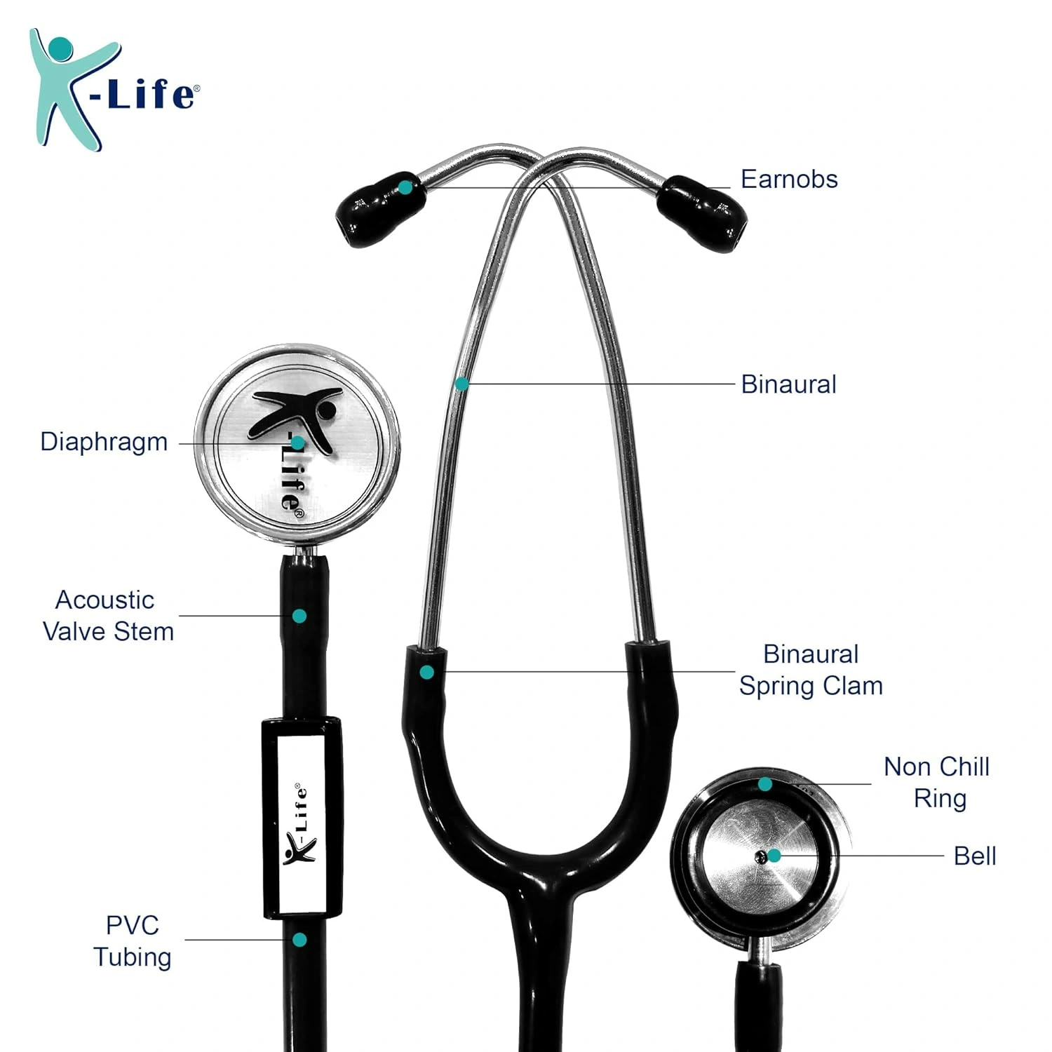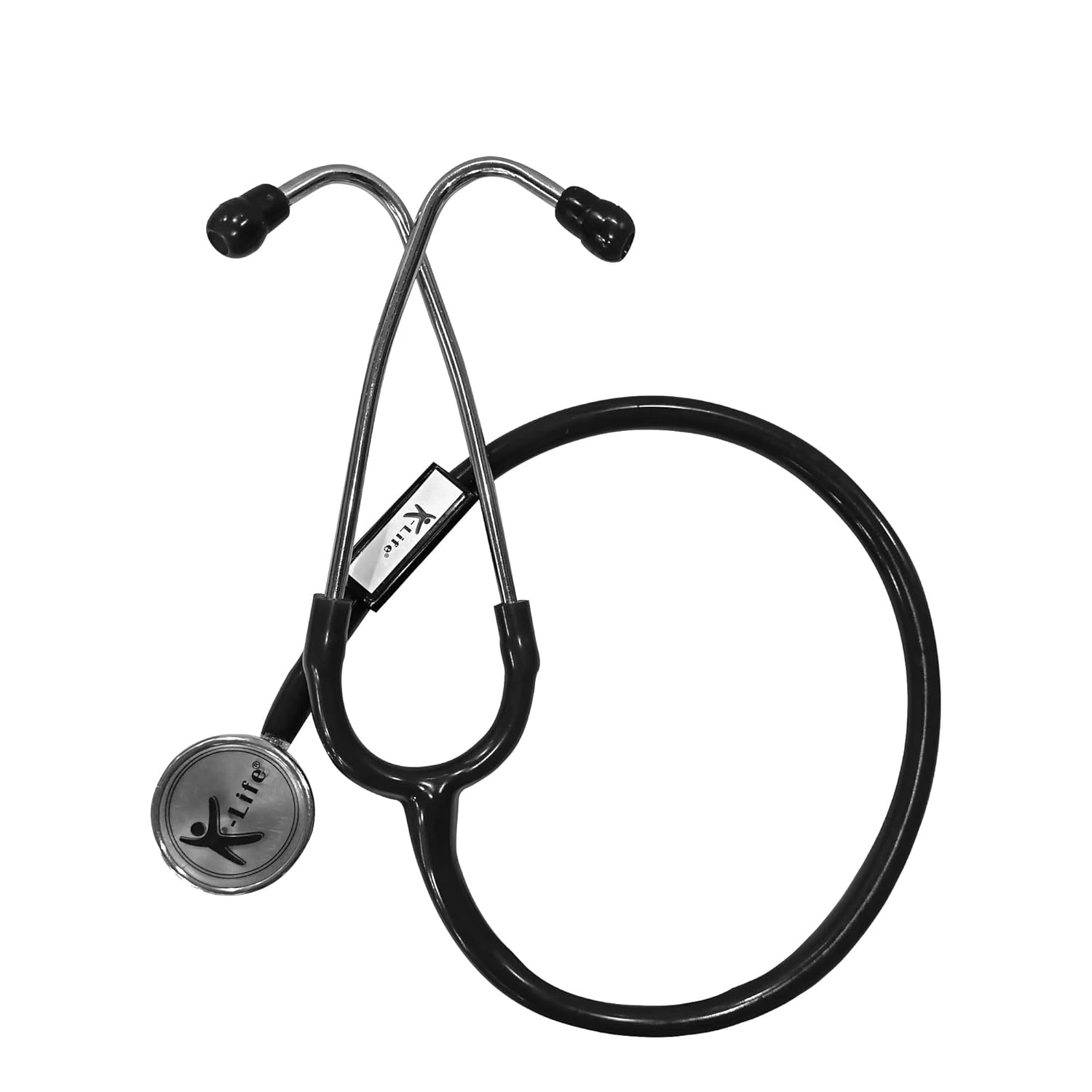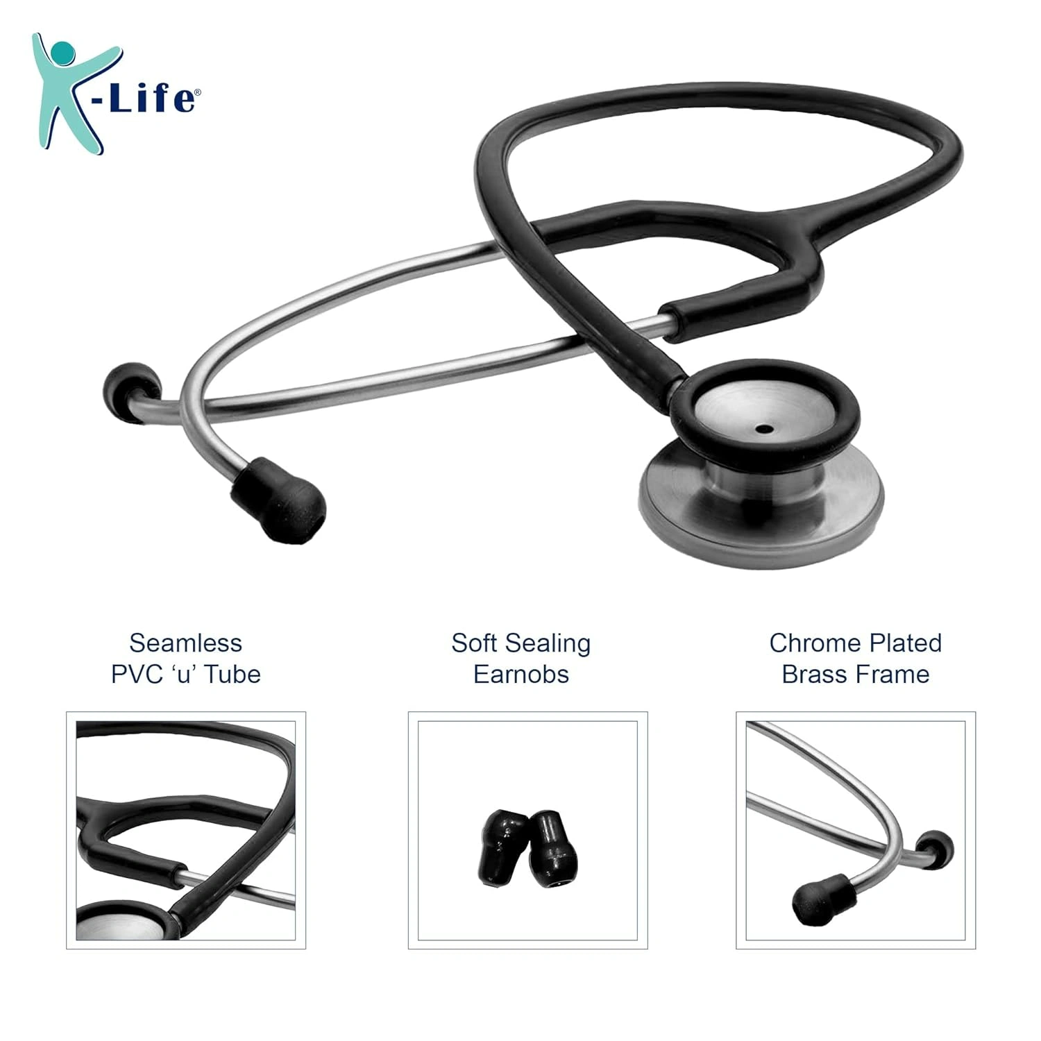 Lightweight aluminum chest piece, flexible jointless tube, and soft sealing ear knobs for medical students and professionals.